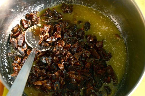 Когда кристаллики разошлись, добавляем финики. Держим на огне около 4 минут.