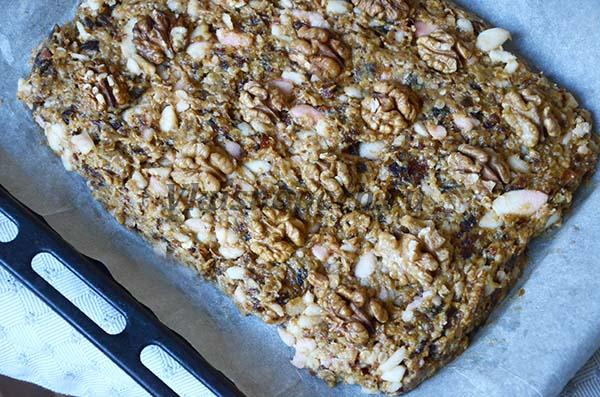Полученную массу выкладываем на противень. Предварительно застилаем его пергаментом. Разравниваем по всей поверхности. Раскладываем сверху половинки орехов, из расчета на то, что этот пласт мы будем разрезать на квадратики.