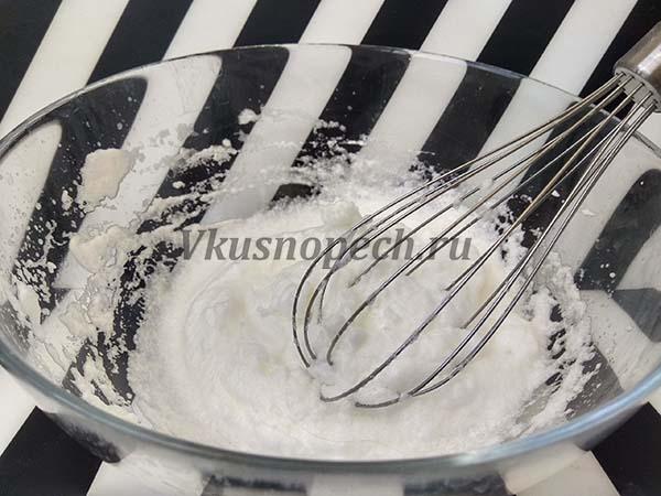 Белок хорошо взбиваем, до крепких пиков. Лучше всего это сделать миксером.