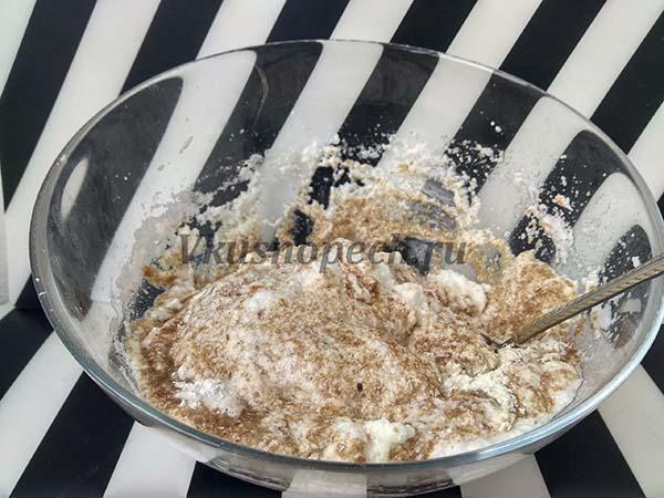 Соединяем обе массы. Добавляем разрыхлитель. Хорошо перемешиваем.
