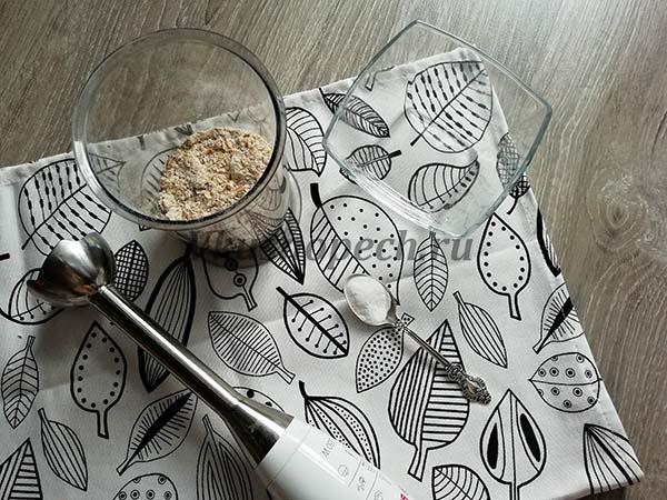 Первоначально, измельчаем хлопья в мелкую крошку, посредством кофемолки. В отдельной емкости перемешиваем получившуюся муку с разрыхлителем.