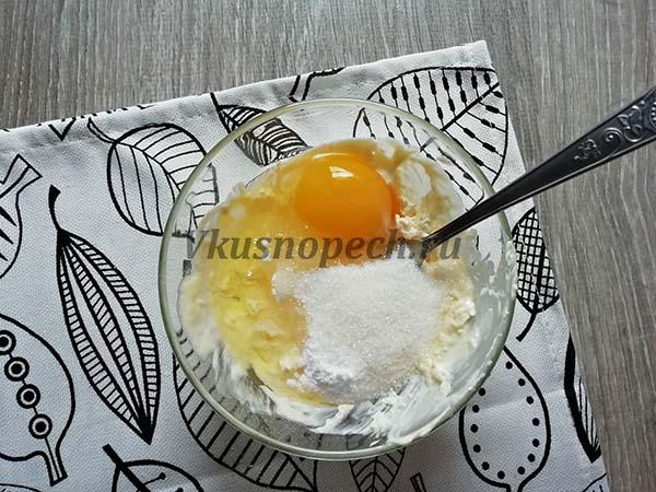 Отдельно разминаем масло, добавляем сахар, ванилин и яйцо.