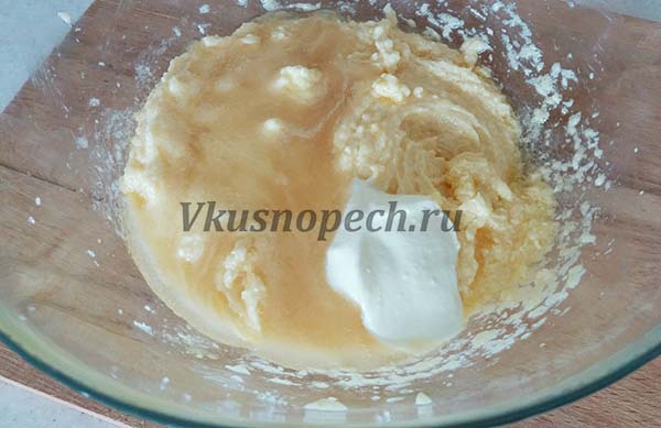 Добавляем сметану, жидкий мед и еще раз немного взбиваем.