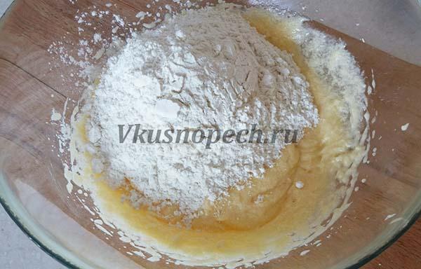 Муку смешиваем с щепоткой соды и всыпаем в основную смесь. Перемешиваем лопаткой до однородности.