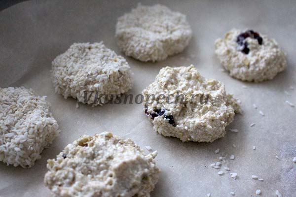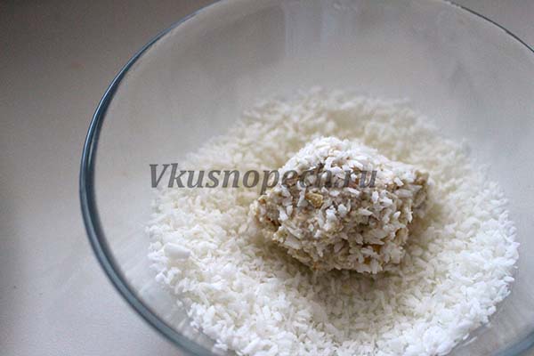 Из первой, формируем печенки, окунаем в стружку кокоса, выкладываем, поверх застеленного пергаментной бумагой, противня.