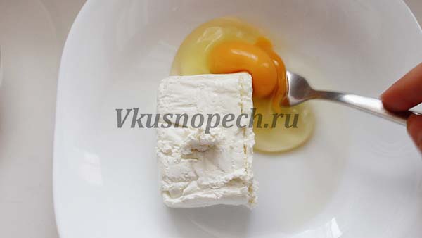 Творог размять с яйцом. (Овсяно-творожное печенье допускает использование простого творога или зернистого).
