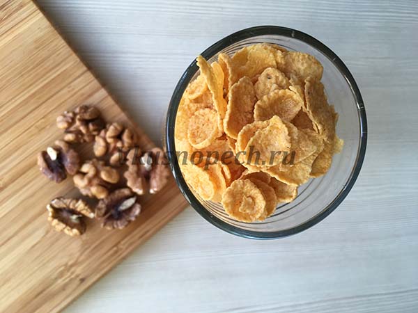 Первым делом измельчаем кукурузные хлопья и орехи.