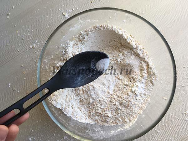 В чистую глубокую емкость перекладываем полученную орехово-кукурузную крошку. Сюда же добавляем муку, овсяные хлопья, кокосовую стружку, соду и соль.