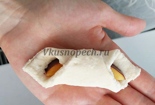 В каждый квадратик кладем начинку, накрываем одним уголком, а затем и вторым. Получаются такие “платочки”.