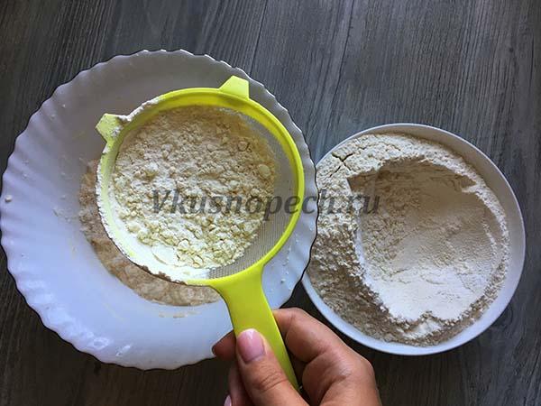 Разрыхлитель добавляем в муку, смешиваем и просеиваем. Добавляем половину муки в основную массу. Смешиваем до однородности.