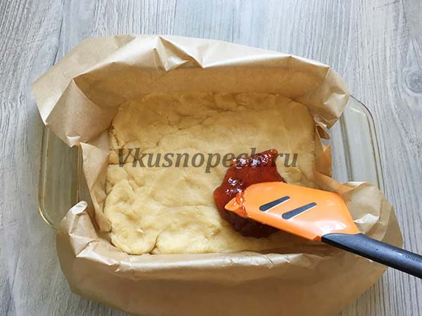 По истечению времени, достаем большую часть из холодильника, и распределяем его по форме. Дно формы для выпечки предварительно необходимо застелить пергаментом.