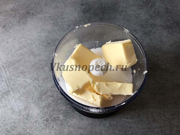 Для замешивания теста удобнее воспользоваться блендером. В специальную чашу отправляем муку, сахарный песок, соль и сливочное масло. Масло должно быть холодным. Для удобства нарежьте его небольшими кубиками.