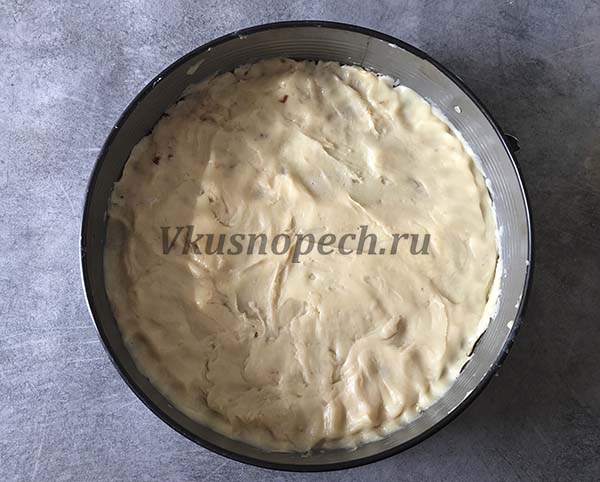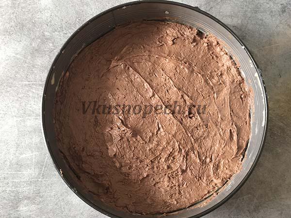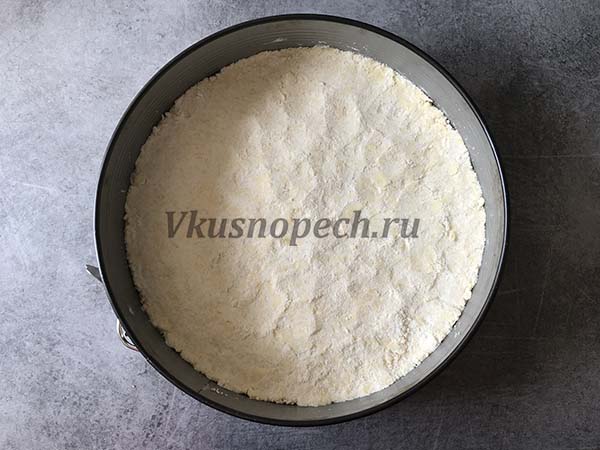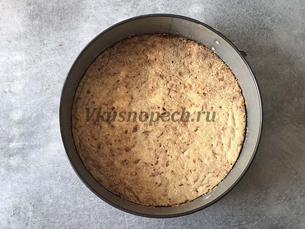 Выкладываем в форму получившуюся крошку, и придавливаем сверху лопаткой, формируя корж.