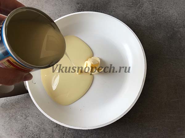 Для приготовления карамели, на антипригарную сковороду выкладываем сгущенку и масло. Массу необходимо довести до кипения, соблюдая два условия: