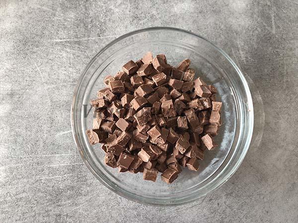 Пока карамель остывает, мелко рубим шоколад при помощи ножа. Его нам необходимо растопить. Сделать это можно используя микроволновку, либо на водяной бане. Особой разницы нет.
