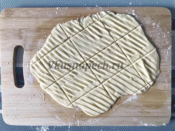 Раскатываем шар в пласт толщиной 0,5 см и формируем изделия. По поверхности можно пройтись скалкой с нанесенным рисунком, это придаст дополнительной “нарядности”. Хотя, наверняка, вкус десерта не станет хуже, если сформировать его старым проверенным способом – с помощью стакана.