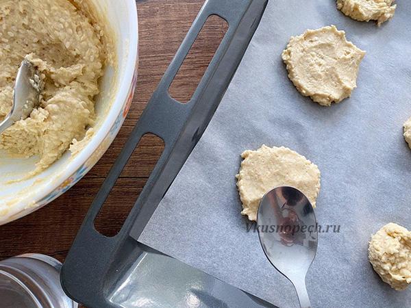 Далее вооружаемся чайной ложкой и просто раскладываем шарики теста на расстоянии 4-5 см друг от друга.