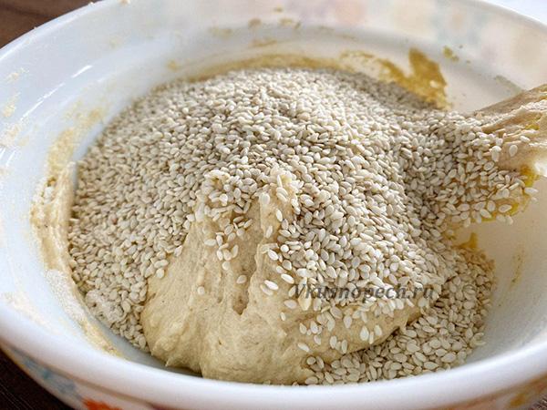 Финальный этап – отправляем в тесто кунжут. Можно его предварительно обжарить на сковороде около 4 минут. Но я этого не делала. Добавила в сыром виде, о чем ни капельки не пожалела))