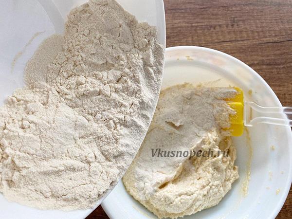 Начнем с подготовки сухих ингредиентов. Для этого в глубокой емкости смешайте просеянную муку, соль и разрыхлитель. Размешиваем тщательно, чтобы разрыхлитель распределился равномерно.