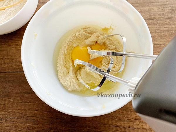 Масло с сахаром взбиваем при помощи миксера до получения пышной белой массы (минуты 2). Затем добавляем яйцо, лимонный сок, и снова хорошо взбиваем до однородности.
