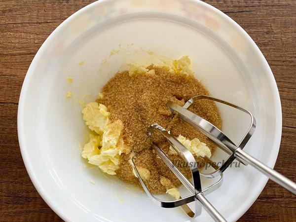 В другую емкость отправляем очень мягкое (не растопленное) сливочное масло и сахар. Я в данном случае использую тростниковый сахар. Мне нравится его легкий карамельный привкус в выпечке. Но если такового под рукой нет, используйте обычный белый.