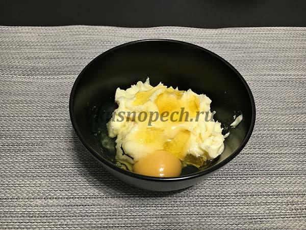 В сахарно-масляную массу добавить яйцо и мед (жидкий). Если мед загустел, подогрейте его, используя микроволновую печь.