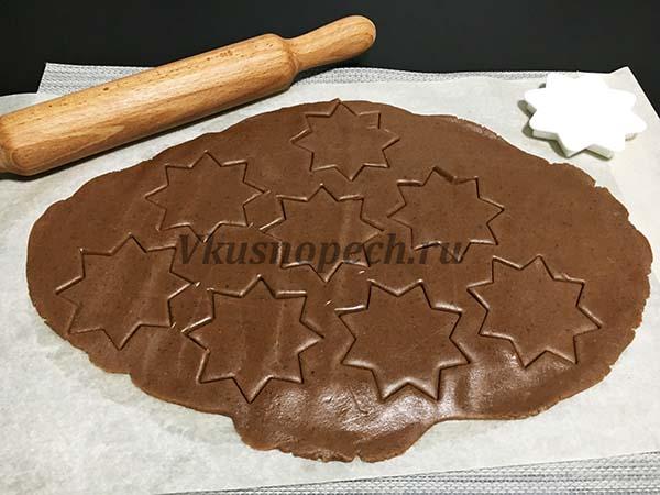 После того, как тесто охладилось, разделите его на две части, и отправьте одну из них обратно в холодильник. Вторую – раскатайте на пергаментной бумаге, потому как возможности транспортировать сформированное печенье у Вас не будет. Это связано с тем, что тесто легко деформируется, и четкость контуров будет нарушена.