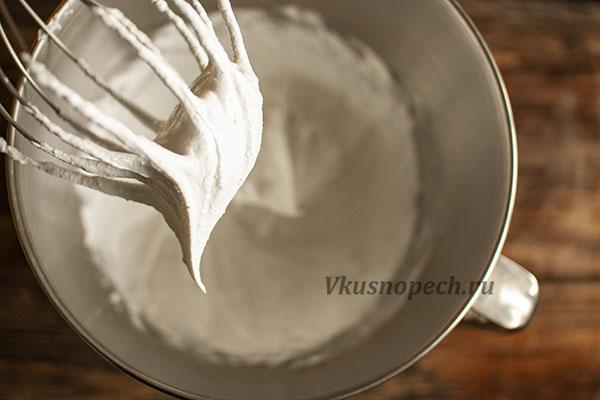Когда взобьётся в белую пену, начинаем подсыпать сахар небольшими порциями. Когда сахар ввели, увеличиваем скорость миксера до максимальной и взбиваем до получения “крепких пиков”.