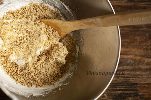 В безе добавляем рубленые орехи. Аккуратно перемешать лопаткой.