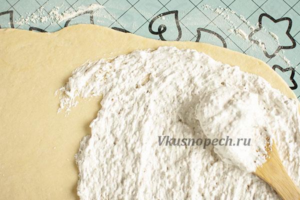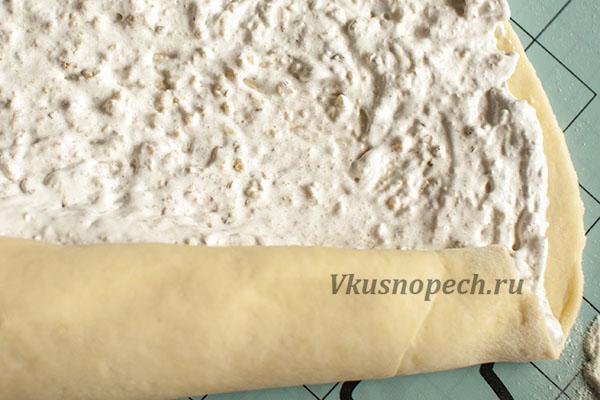 Тесто раскатываем в пласт толщиной 0,5 см. Наносим начинку не толстым слоем.