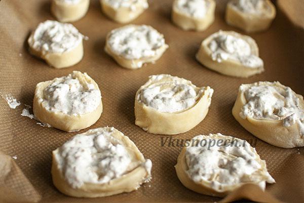 Заготовки выкладываем на застеленный пергаментом противень. Отправляем в разогретую духовку выпекаться при 180 градусах на 15-18 минут.