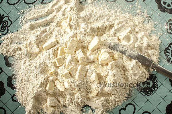 Рубим сливочное масло на мелкие кусочки ножом вместе с мукой. Затем перетираем массу руками. Должна получиться мелкая маслянистая крошка.