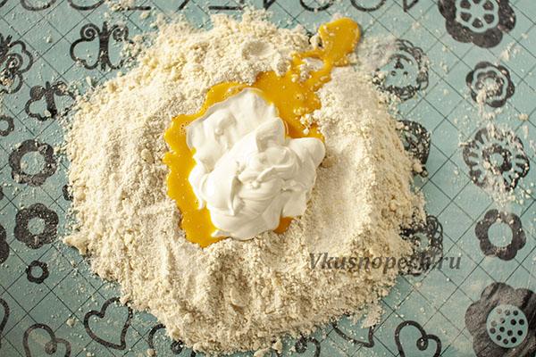 В полученной на первом этапе массе делаем углубление. Отправляем туда желтки и сметану. Замешиваем тесто.