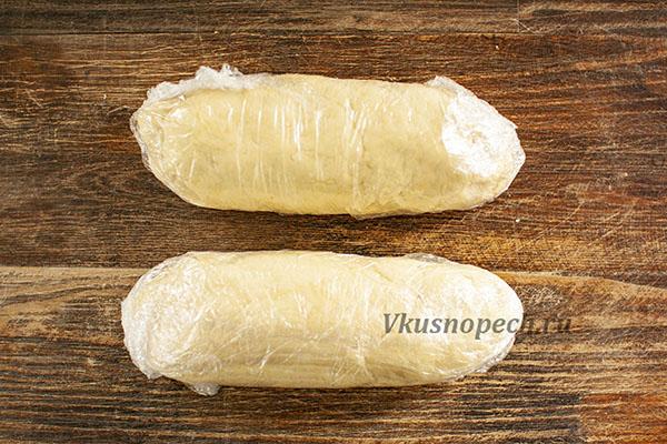 Готовое тесто делим на 2 части. Каждую обернуть в пленку и отправить в холодильник на 1,5 часа.