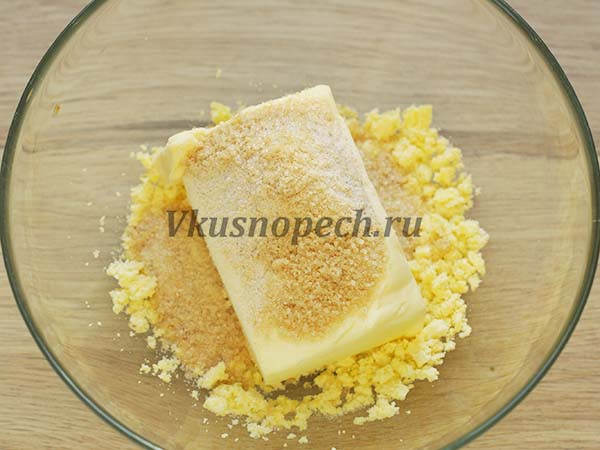 Сваренные вкрутую яичные желтки разминаем вилкой. Добавляем сливочное масло (очень мягкое), два вида сахара и соль. Тщательно перемешиваем.