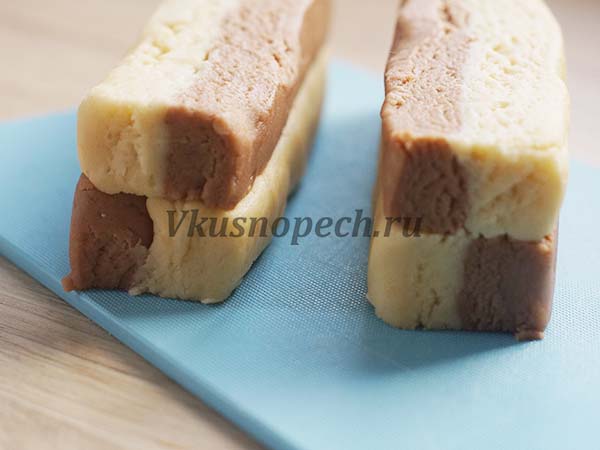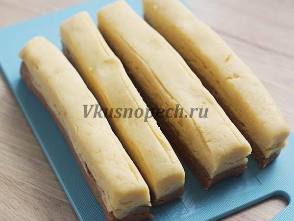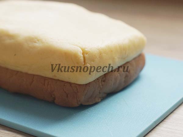 Раскатываем оба шара, стараясь придать пласту форму прямоугольника. Ванильное тесто выкладываем поверх шоколадного.
