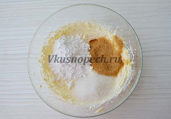 Добавляем два вида сахара, сахарную пудру и соль. Взбиваем около 3 минут.