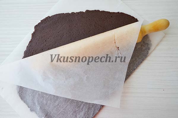 Полученное тесто, делим на 2 части. Каждую раскатываем в пласт толщиной 0,5 см. Удобнее всего раскатывать между двумя листами пергамента. Так тесто не прилипает ни к столу, ни к скалке.