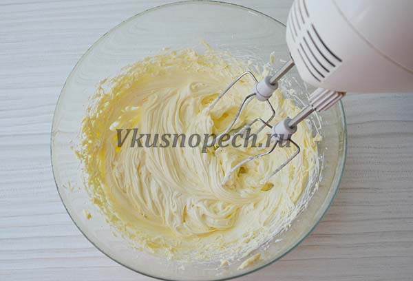 Начинаем с того, что хорошо миксером взбиваем масло. Для этого оно должно быть очень мягким. Взбивать нужно до тех пор, пока масло не превратится в воздушную белую массу.