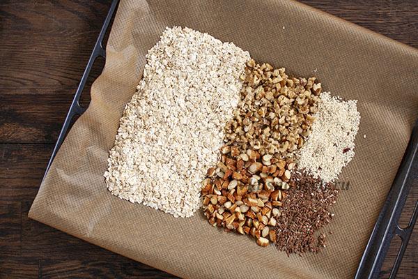 На противень, застеленный пергаментом, выкладываем орехи (порубить предварительно ножом), овсяные хлопья, кунжут и семена льна. Отправляем в разогретую до 180 градусов духовку на 7 минут.