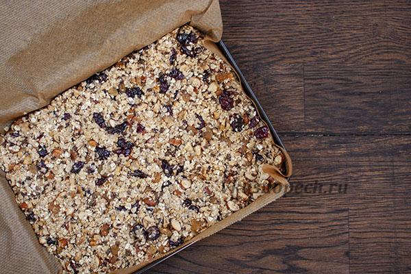 В таком виде оставляем форму с заготовкой на пару часов. После чего, аккуратно разрезаем пласт на небольшие кусочки.