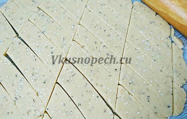 При помощи ножа нарезаем заготовки для сырного печенья на скорую руку. Раскладываем на противень, застеленный пергаментом. Расстояние между изделиями должно быть около сантиметра.
