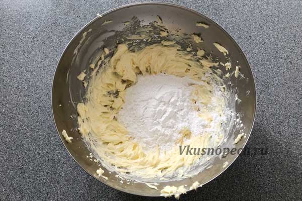 К моменту, когда вы начнете процесс приготовления печенья, сливочное масло должно быть очень мягким. Взбиваем его на средней скорости миксера до пышности (1-2 минуты). Затем добавляем сахарную пудру, ванильный сахар и щепотку соли. Взбиваем до однородности.