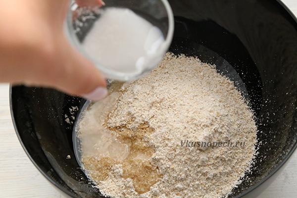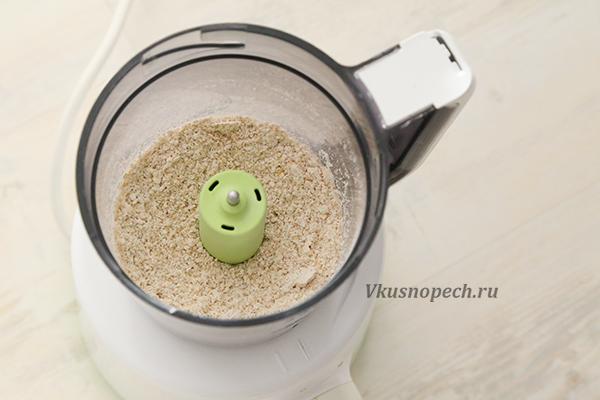Хлопья помещаем в блендер (кофемолку) и измельчаем. Перекладываем в глубокую емкость, в которой будем замешивать тесто.