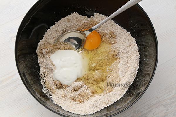 Добавляем сметану, яйцо и тщательно перемешиваем.