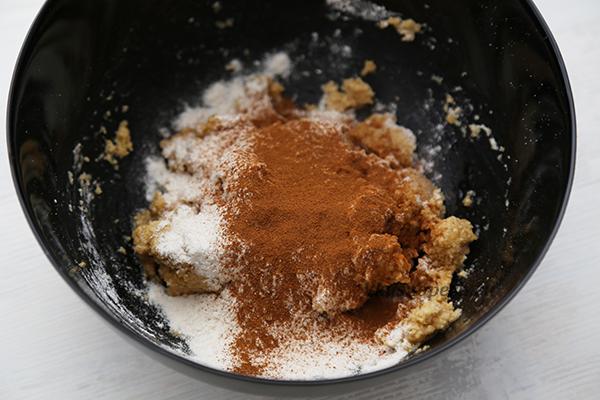 Далее в тесто отправляем жидкий мед, просеянную муку, соду, корицу и сахарозаменитель. Вымешиваем.