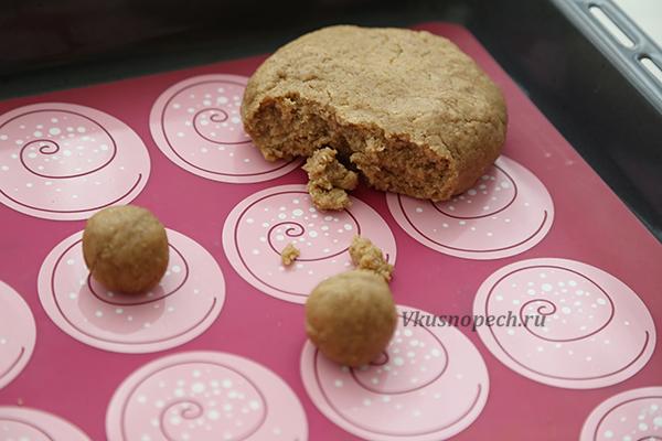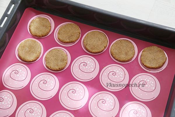 Формируем небольшие шарики (немного меньше грецкого ореха), кладем их на противень, застеленный пергаментом, и приплюскиваем сверху ладонью, либо дном стакана.