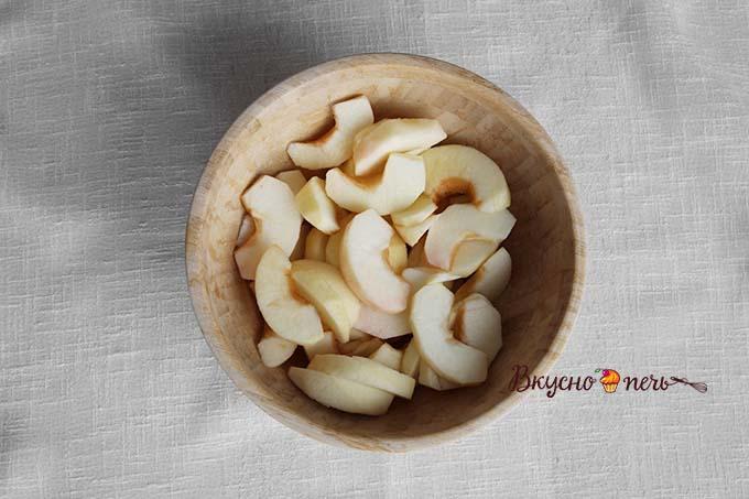 Взять два яблока по вашему вкусу: сладкие или кисло-сладкие, вымыть. Очистить от кожуры, убрать сердцевину, порезать на тонкие слайсы. Сбрызнуть соком лимона, если не хотите, чтобы они потемнели, пока готовятся остальные ингредиенты. Вес в граммах указан очищенных яблок.