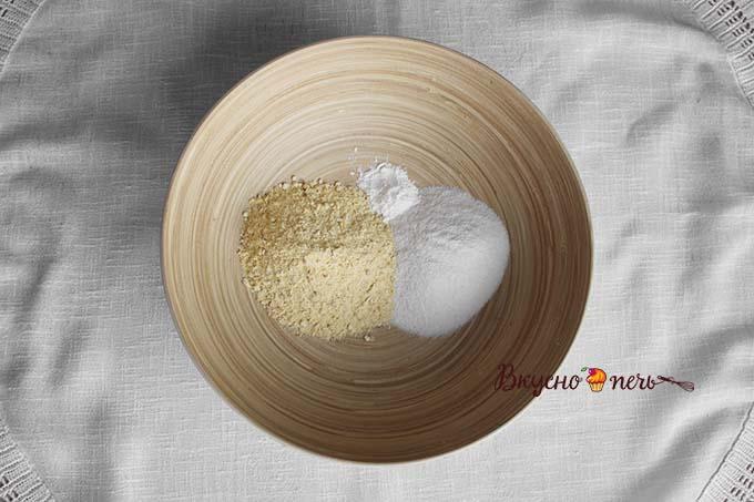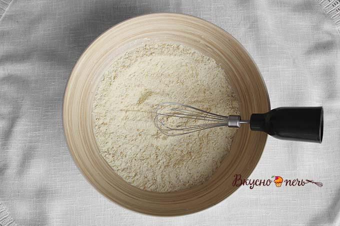 Приготовить сухую смесь. Отмерить муку, разрыхлитель, соль. Если нет цельнозерновой, то хорошим вариантом будет обычная рисовая и нутовая мука. В любом случае она содержит белок, витамины и минералы, в ней нет глютена. По желанию добавить корицу, имбирь и ваниль.