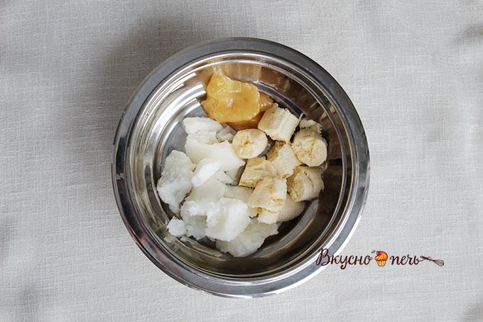 Приготовить жидкую смесь. Взять один большой спелый банан, отмерить масло и мед. Если заранее не достали масло из холодильника и мед твердоват, то стоит немного подогреть их на плите.